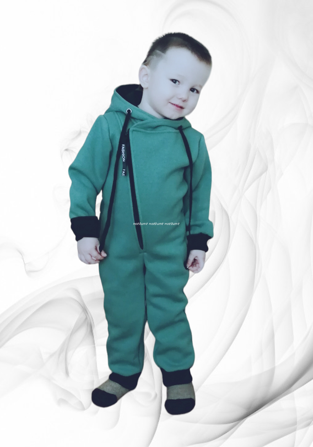 Комбинезон с капюшоном на подкладке, с открытыми ножками, рукавчики на манжете, спереди на косой молнии.